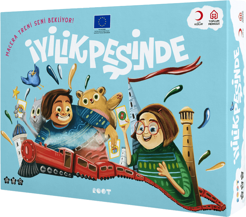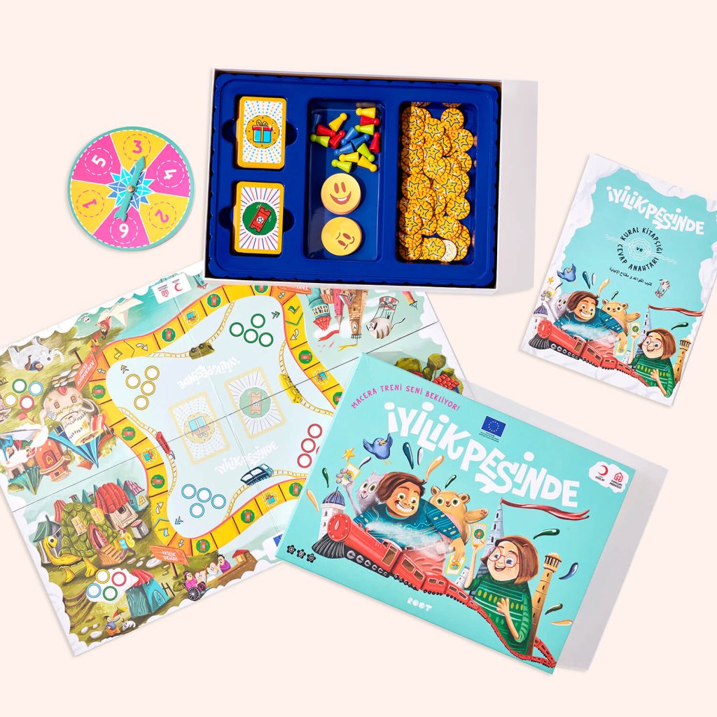 BOX CONTENTS:1 Game Board / 1 Number Wheel / 16 Emotion Tokens / 16 Pawns / 75 Ticket Cards / 35 Surprise Cards / 64 Kindness Badges / 1 Rulebook ( TR / AR )